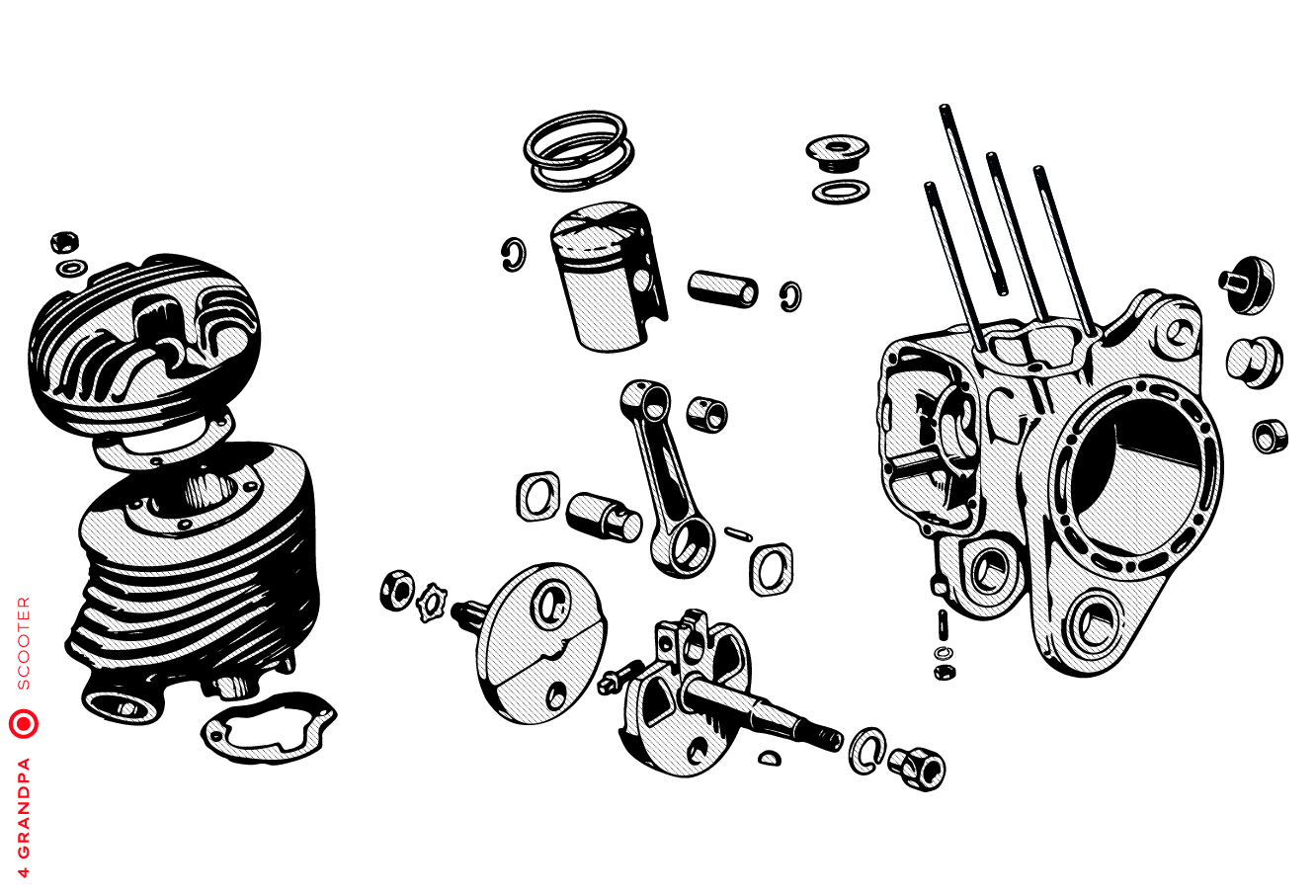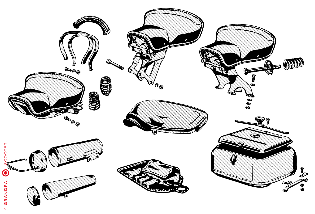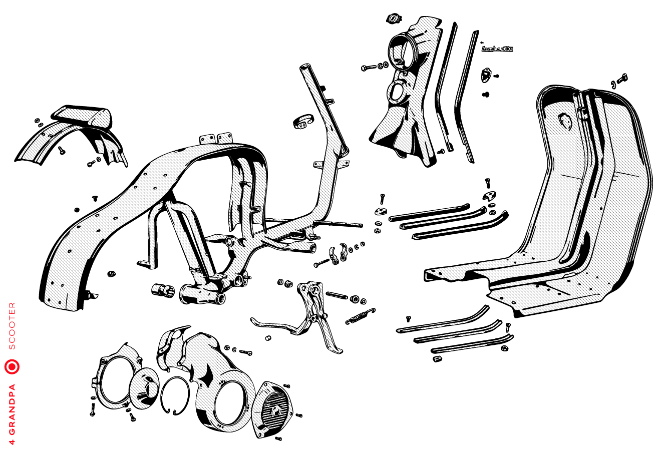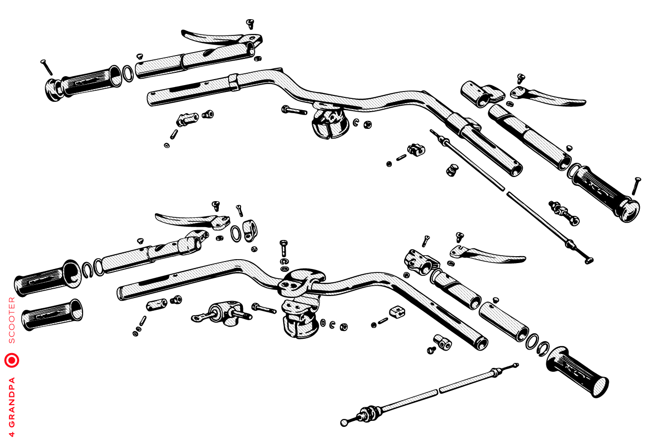 Guidon chromé avec bouchons en aluminium, freins arrières à levier arrière, tube à outils conique sous la selle avec bouchons à articulation rapprochée, housses de selle marron, LD avec capot moteur latéral avec deux trous pour la sortie d’air, emblème en plastique sur le tablier à gauche, caches moteur latéraux avec un seul trou ovale pour la sortie d’air (les premiers modèles de 1953 avaient des caches moteur à deux trous). Selles vert foncé à partir de 1954, armatures de selle plus grandes.