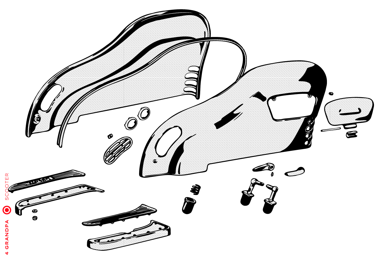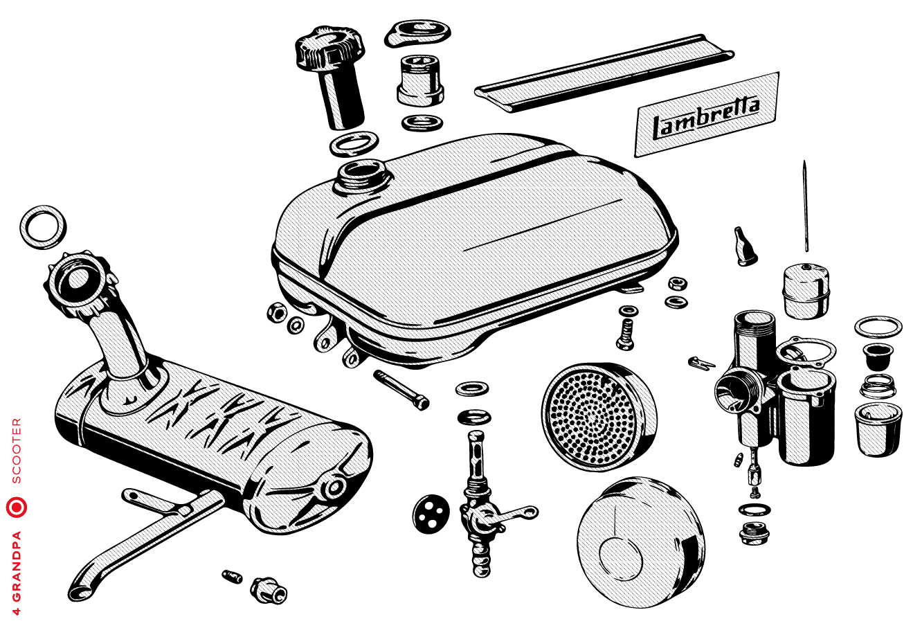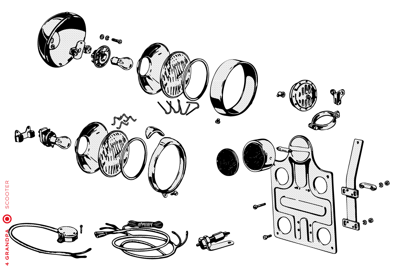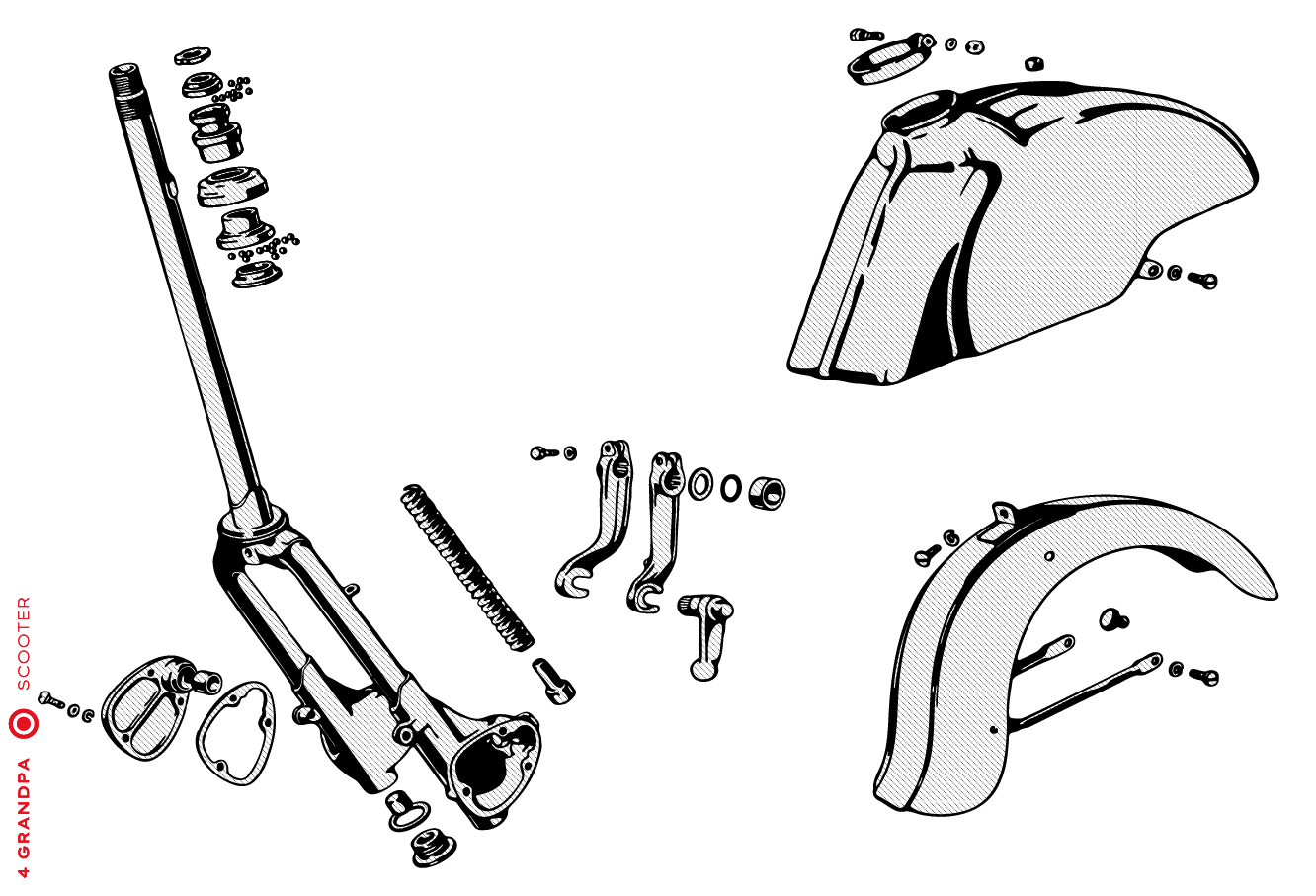 Guidon chromé avec bouchons en aluminium, freins arrières à levier arrière, tube à outils conique sous la selle avec bouchons à articulation rapprochée, housses de selle marron, LD avec capot moteur latéral avec deux trous pour la sortie d’air, emblème en plastique sur le tablier à gauche, caches moteur latéraux avec un seul trou ovale pour la sortie d’air (les premiers modèles de 1953 avaient des caches moteur à deux trous). Selles vert foncé à partir de 1954, armatures de selle plus grandes.