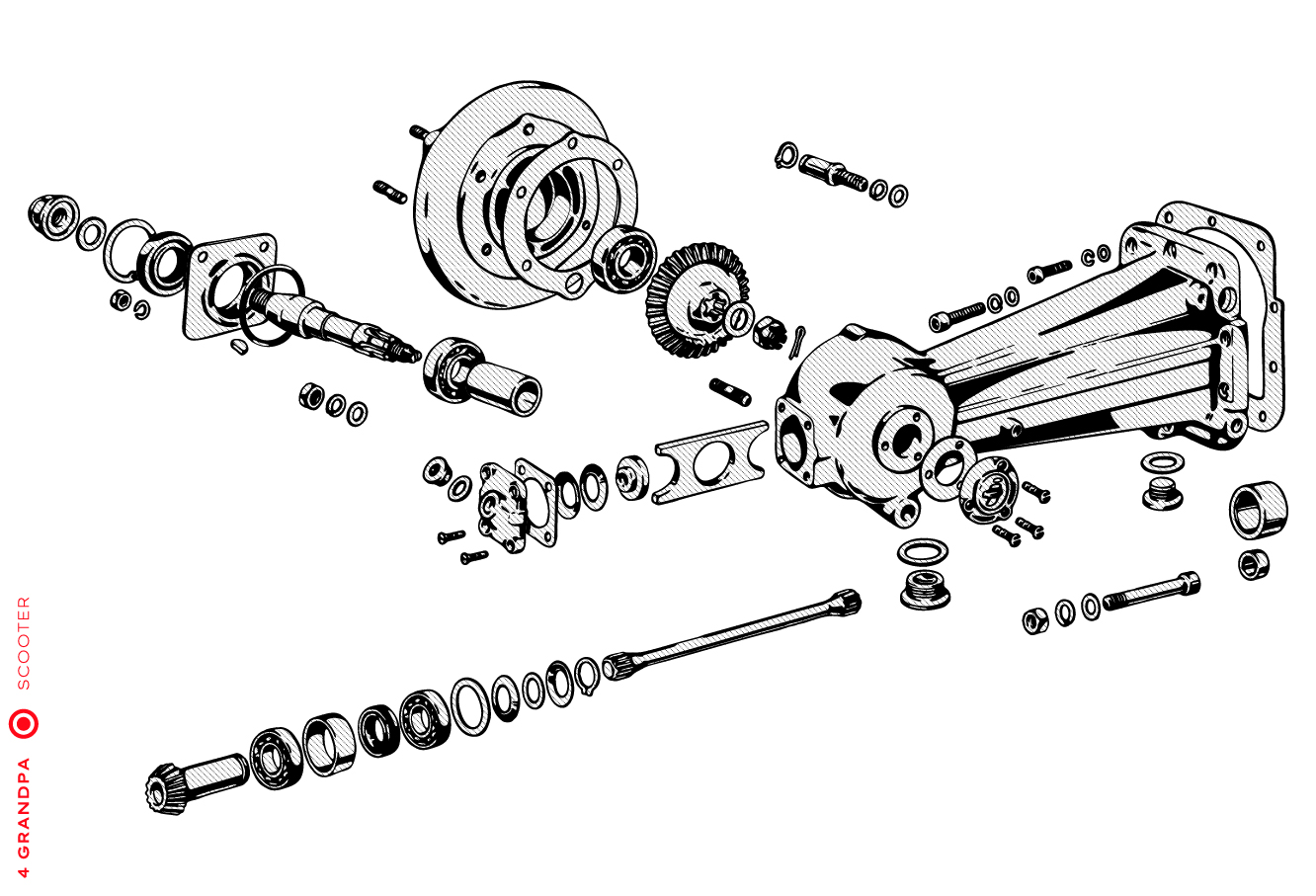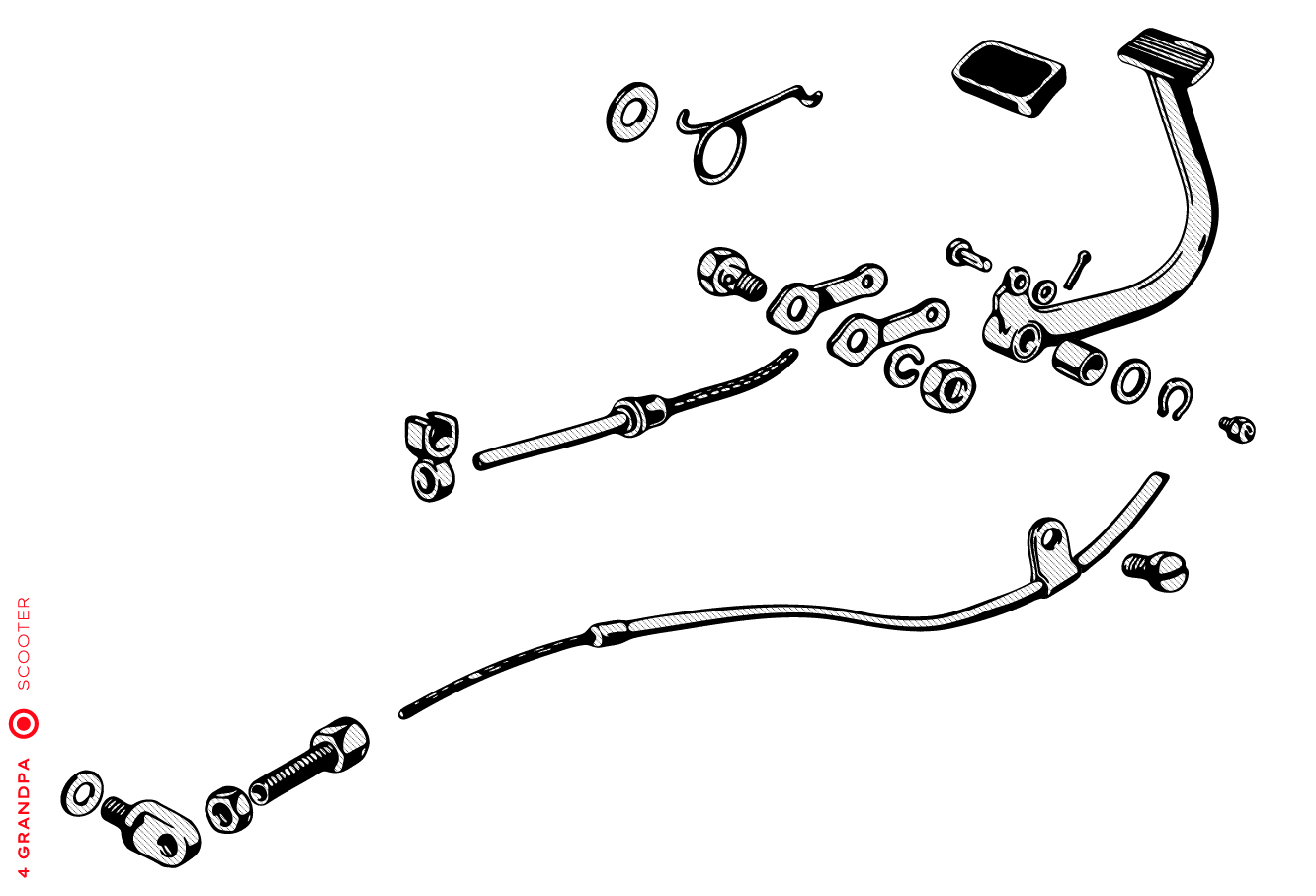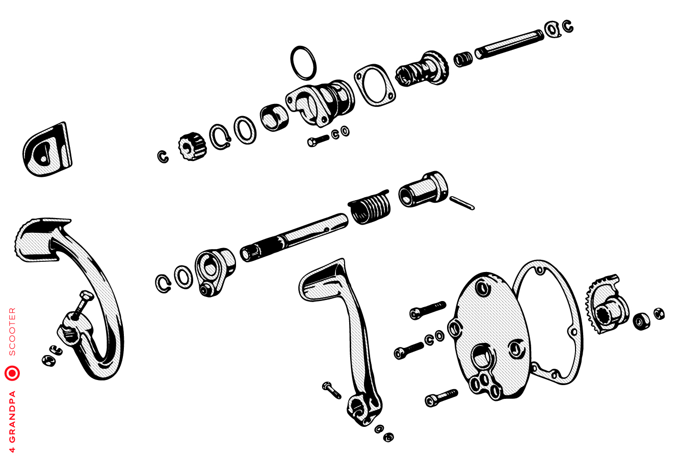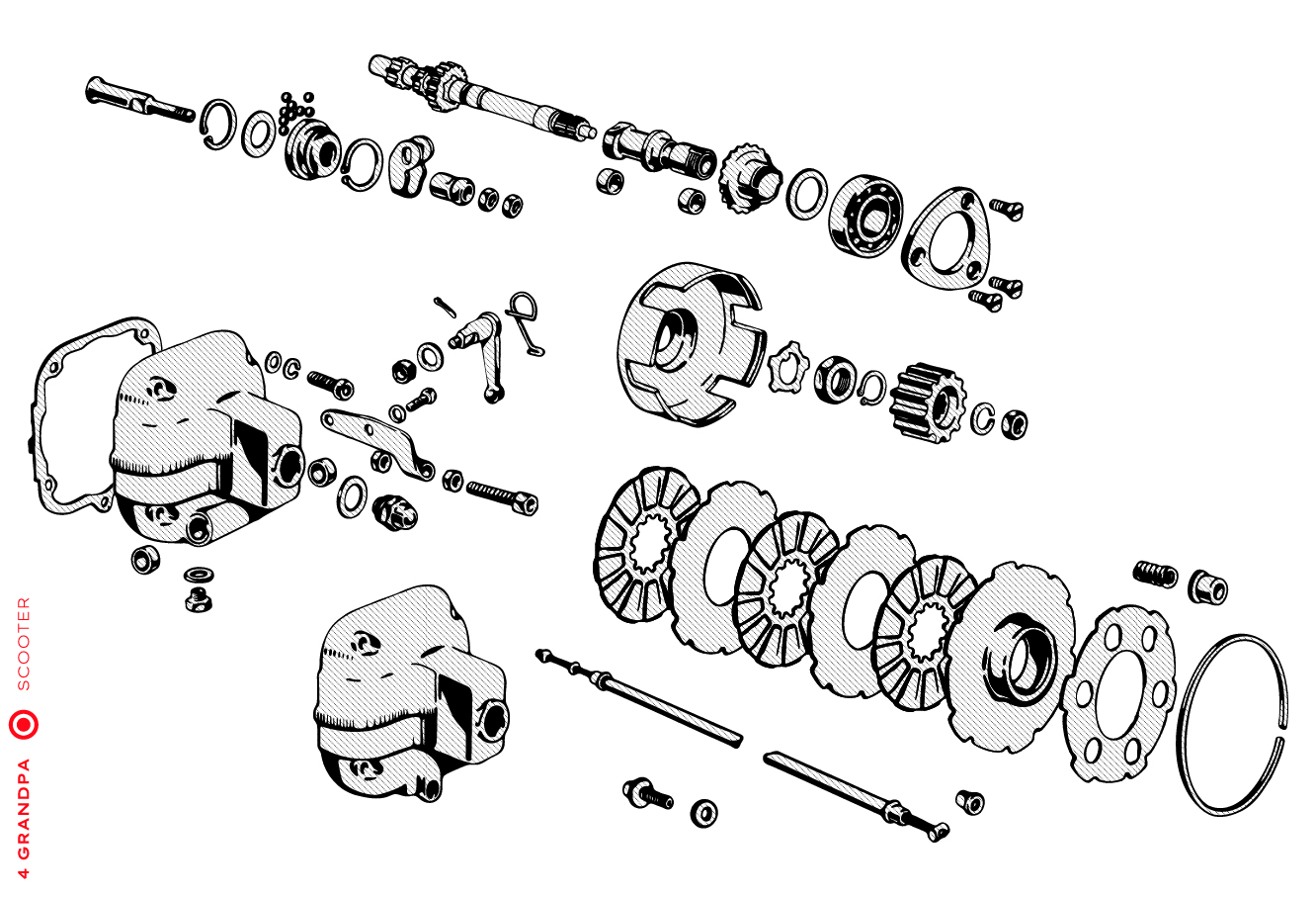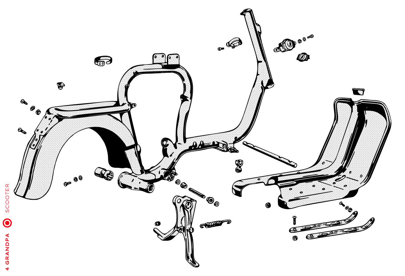 Guidon chromé avec bouchons en aluminium, freins arrières à levier arrière, tube à outils conique sous la selle avec bouchons à articulation rapprochée, housses de selle marron, LD avec capot moteur latéral avec deux trous pour la sortie d’air, emblème en plastique sur le tablier à gauche, caches moteur latéraux avec un seul trou ovale pour la sortie d’air (les premiers modèles de 1953 avaient des caches moteur à deux trous). Selles vert foncé à partir de 1954, armatures de selle plus grandes.