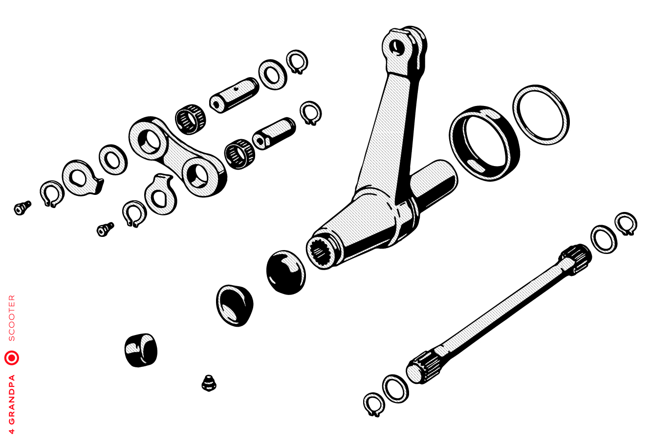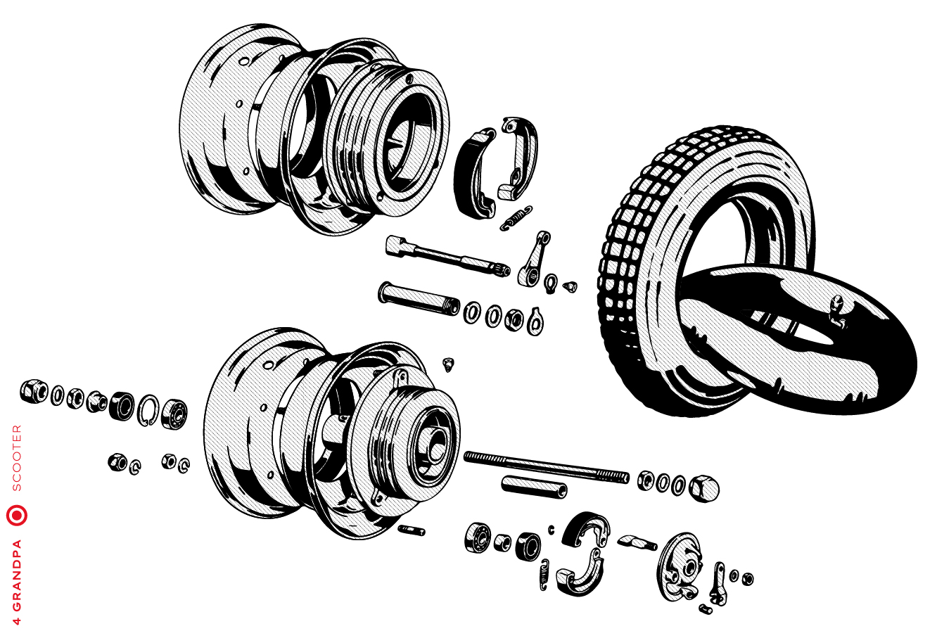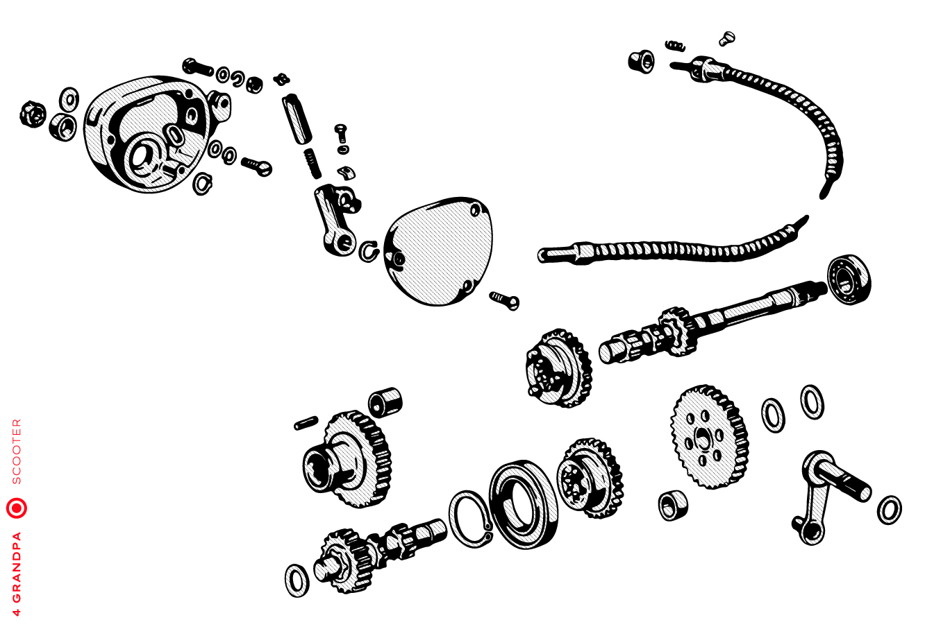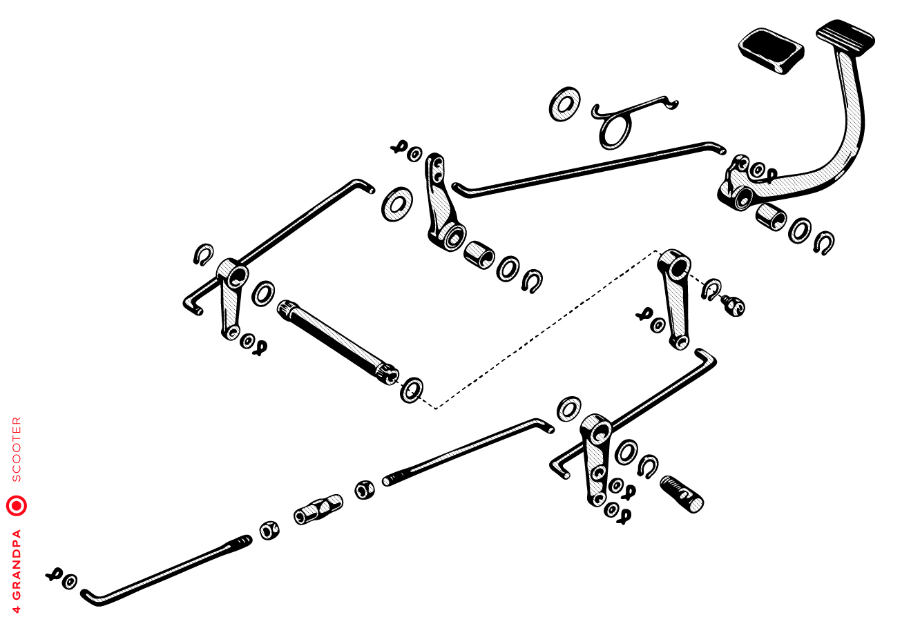 Guidon chromé avec bouchons en aluminium, freins arrières à levier arrière, tube à outils conique sous la selle avec bouchons à articulation rapprochée, housses de selle marron, LD avec capot moteur latéral avec deux trous pour la sortie d’air, emblème en plastique sur le tablier à gauche, caches moteur latéraux avec un seul trou ovale pour la sortie d’air (les premiers modèles de 1953 avaient des caches moteur à deux trous). Selles vert foncé à partir de 1954, armatures de selle plus grandes.